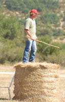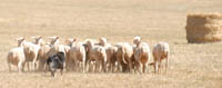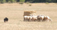Depuis le quad Franck dirige son chien qui lui même dirige les brebis entre les bottes rondes.