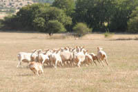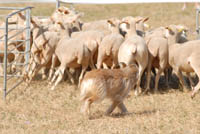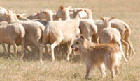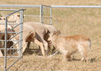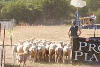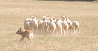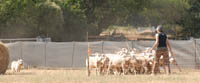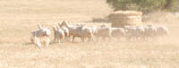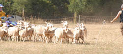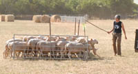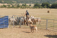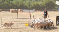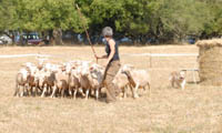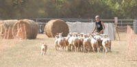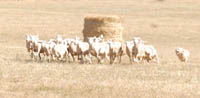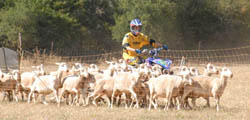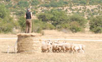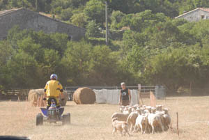 Depuis le quad Véronique dirige son chien qui lui même dirige les brebis entre les bottes rondes.